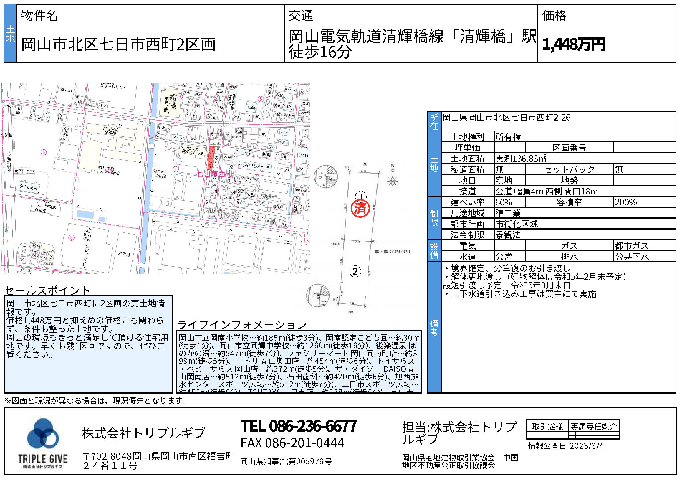 備考境界確定・分筆後の引渡しです。上下水道引込は買主負担。